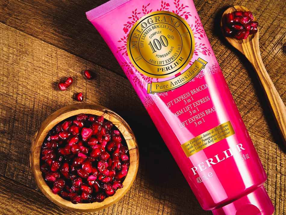 Perlier Pomegranate arm-lift cream on wooden surface with pomegranate seeds