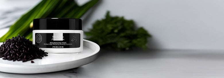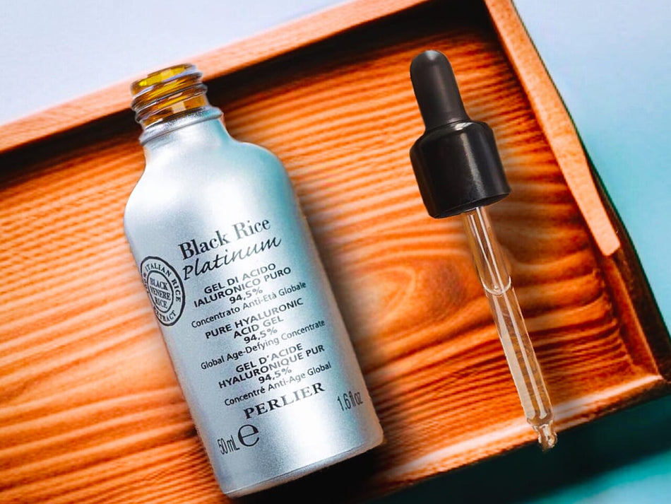 Perlier Black Rice Hyaluronic Acid Gel with dropper on a wooden tray