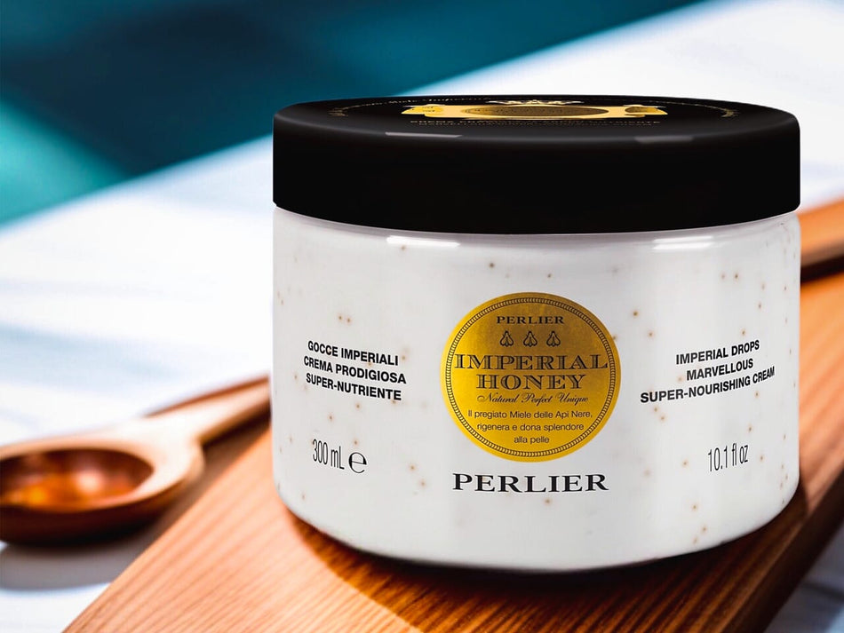Perlier Imperial Honey super-nourishing cream jar on a wooden surface with a blurred background