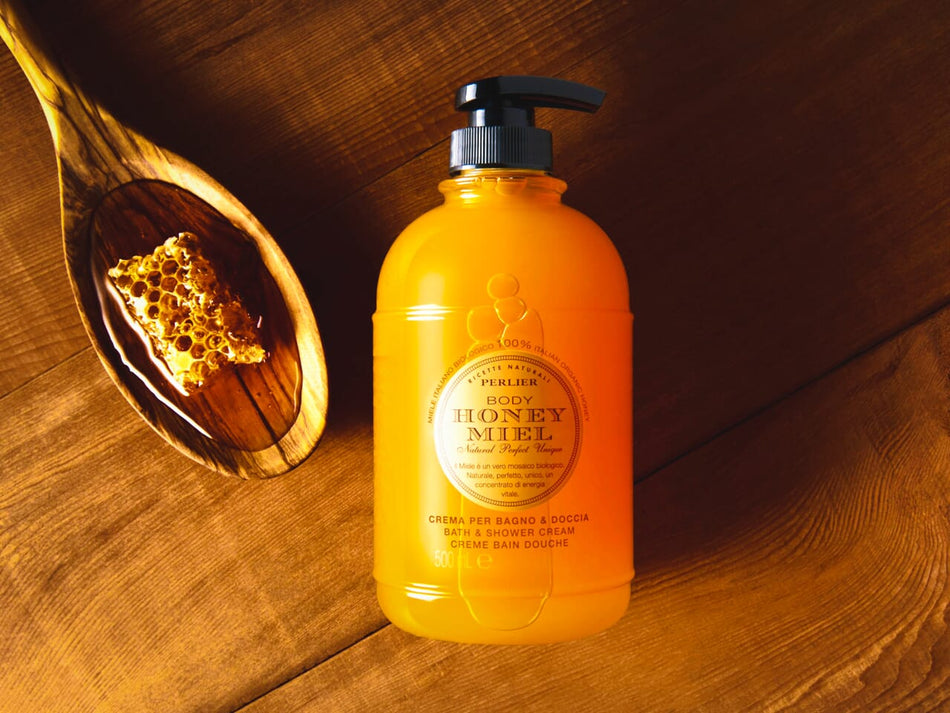 Bottle of Original Honey Miel Bath & Shower Cream on a wooden surface with a wooden spoon and honeycomb.