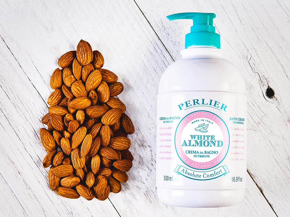 Perlier White Almond body wash bottle next to almonds on a wooden surface